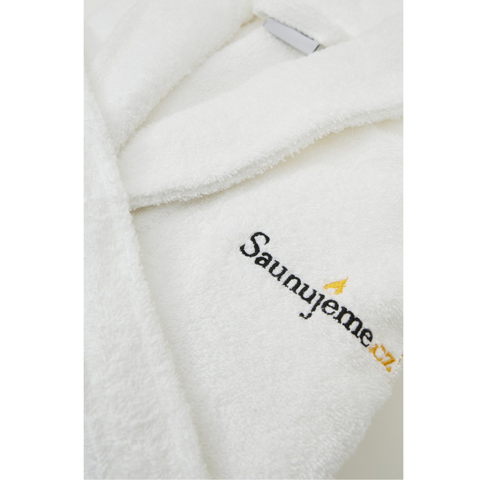 Župan do sauny s dvěma kapsami, páskem na zavazování, poutkem a výšivkou. Kvalitní měkké froté. Barva bílá.