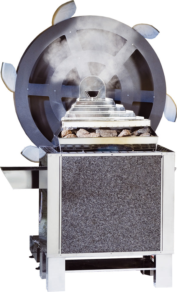 Během provozu se mlýnské kolo otáčí pomalu proti směru hodinových ručiček, a proto je v každé sauně poutačem . Po automatickém signálu se kolo otáčí v opačném směru, takže lopaty přivádějí vodu přímo na kaskádu nad topidlem a poskytují řadu účinných a výkonných infuzí. Velký objem kamene zajišťuje obzvláště rovnoměrné sálavé teplo a velkou kapacitu akumulace tepla.