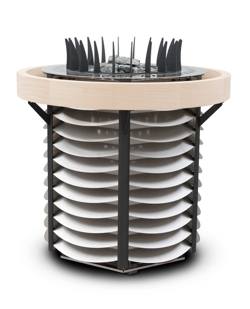 Díky kulatému designu a rovnoměrně všestrannému vzhledu je saunové topení ideální pro instalaci před prosklené plochy a uprostřed saunové kabiny.
